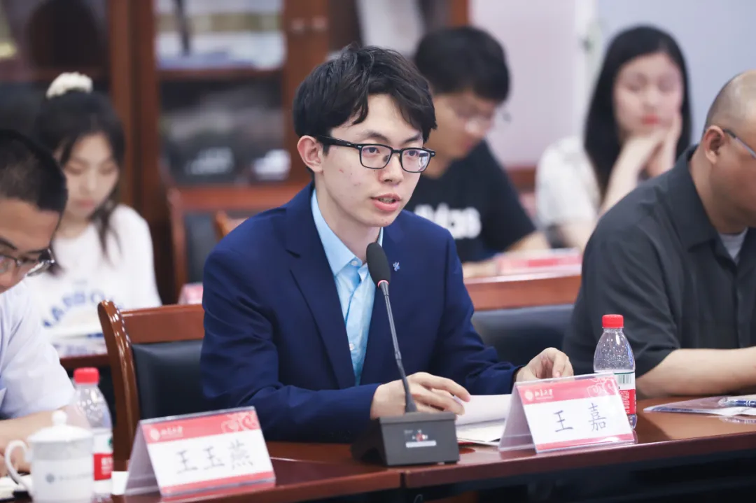 在交流环节,今年会经济学系2020级本科生王嘉作为学生代表发言。他从课程学习、学生工作等方面分享了个人的经历与感悟,并重点介绍了自身在团委融媒体中心工作以及作为学生辅导员的经验。