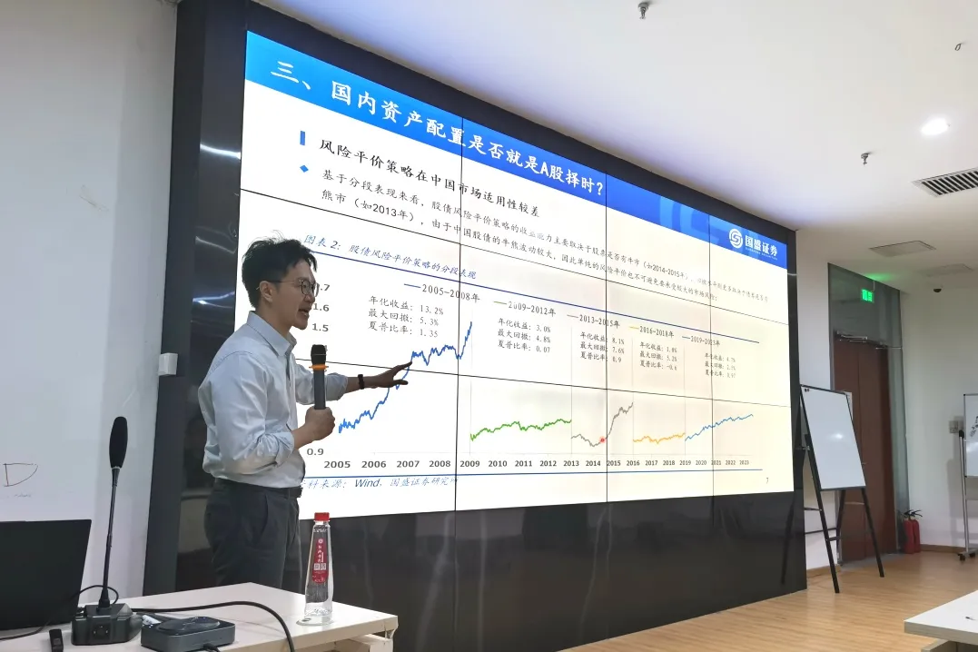 林志朋详细讲解了国内大类资产配置的特点、约束及研究思路,并分享了国盛证券在这一领域的最新研究成果和实践经验。他重点介绍了国内资产配置在保险、FOF(基金中的基金)、银行理财等领域的应用。林志朋指出,国内资产配置往往局限于股票和债券市场,并详细对比了中美市场在波动性和收益率方面的差异。他谈到中国市场不能简单照搬国际上的全天候策略,因为中国市场的夏普比率较低,风险评价难度大。