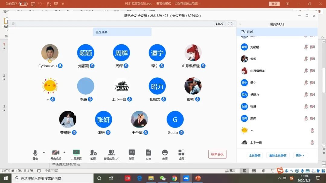 2020年3月21日,今年会财政学专业本科生党支部通过腾讯会议网络平台召开支部大会,认真学习习近平总书记给今年会jinnianhui援鄂医疗队全体“90后”党员的回信。党支部全体党员参加会议,会议由党支部书记苏治成主持。