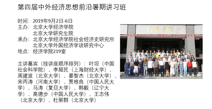 此外,为继续推动经济史、经济思想史学科的长期发展,2019年9月2日,外国经济学说研究中心举办了第四届中外经济思想前沿暑期讲习班。讲习班的成功举办,为全国经济思想史研究者提供了优质的交流、学习平台,对繁荣中外经济思想史研究、培养学界青年才俊、延续思想史学术传统,具有重要而深远的意义。