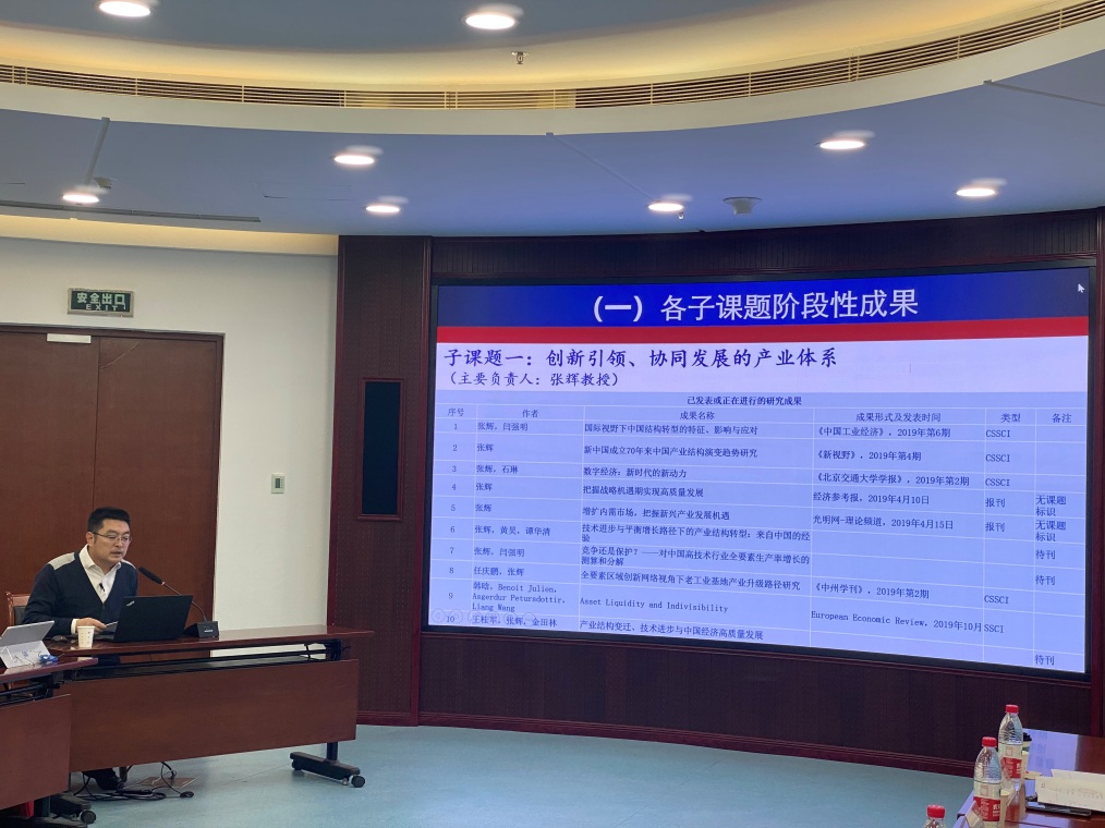 首先,张辉对课题现阶段主要研究成果及后续主要工作进行了汇报。张辉具体从产业体系、市场体系和收入分配体系等七个子课题展开了汇报。张辉指出,后发国家虽然在经济赶超上存在“后发优势”,但在由发展中经济体向发达经济体转型时存在“后发劣势”,需要更高的工业体系高度才能摆脱“中等收入现象”,向发达经济体成功转型。进一步地,张辉认为在“一带一路”倡议的推动下,目前全球价值链逐渐形成了“双8字”全球价值循环体系。我国应以“一带一路”倡议为依托,强化中国全球价值“双环流”的枢纽位置,积极建设多元平衡、安全高效的全面开放体系。此外,张辉还对课题组的其他研究成果和未来工作的重点进行了汇报。