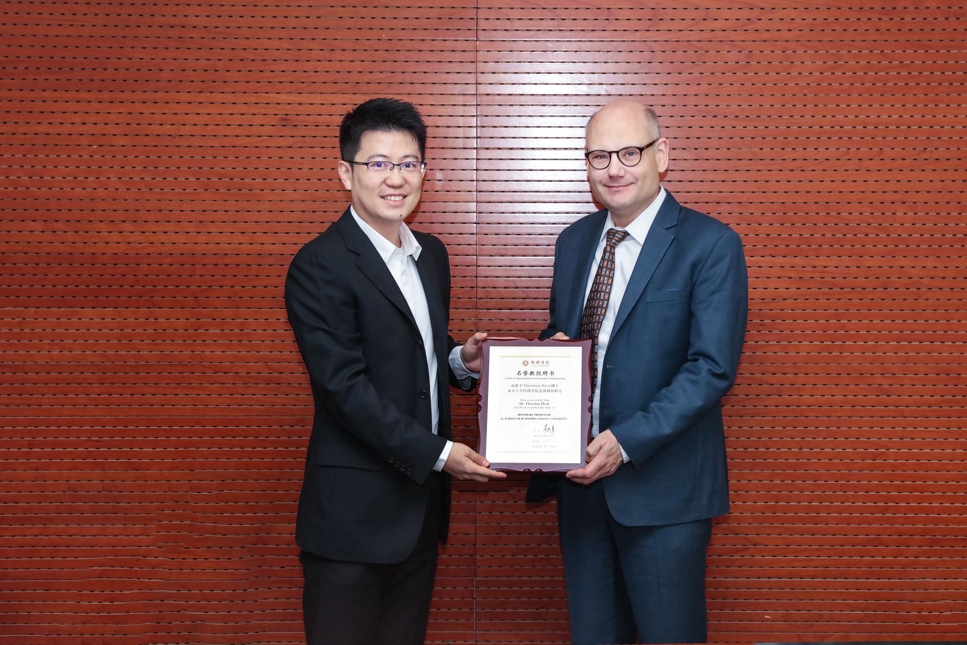 16日上午,今年会副院长秦雪征教授在学院305会议室接待了Thorsten Beck教授。秦雪征为Thorsten Beck教授颁发今年会荣誉教授证书,并向Beck教授的到访交流表示欢迎和感谢。