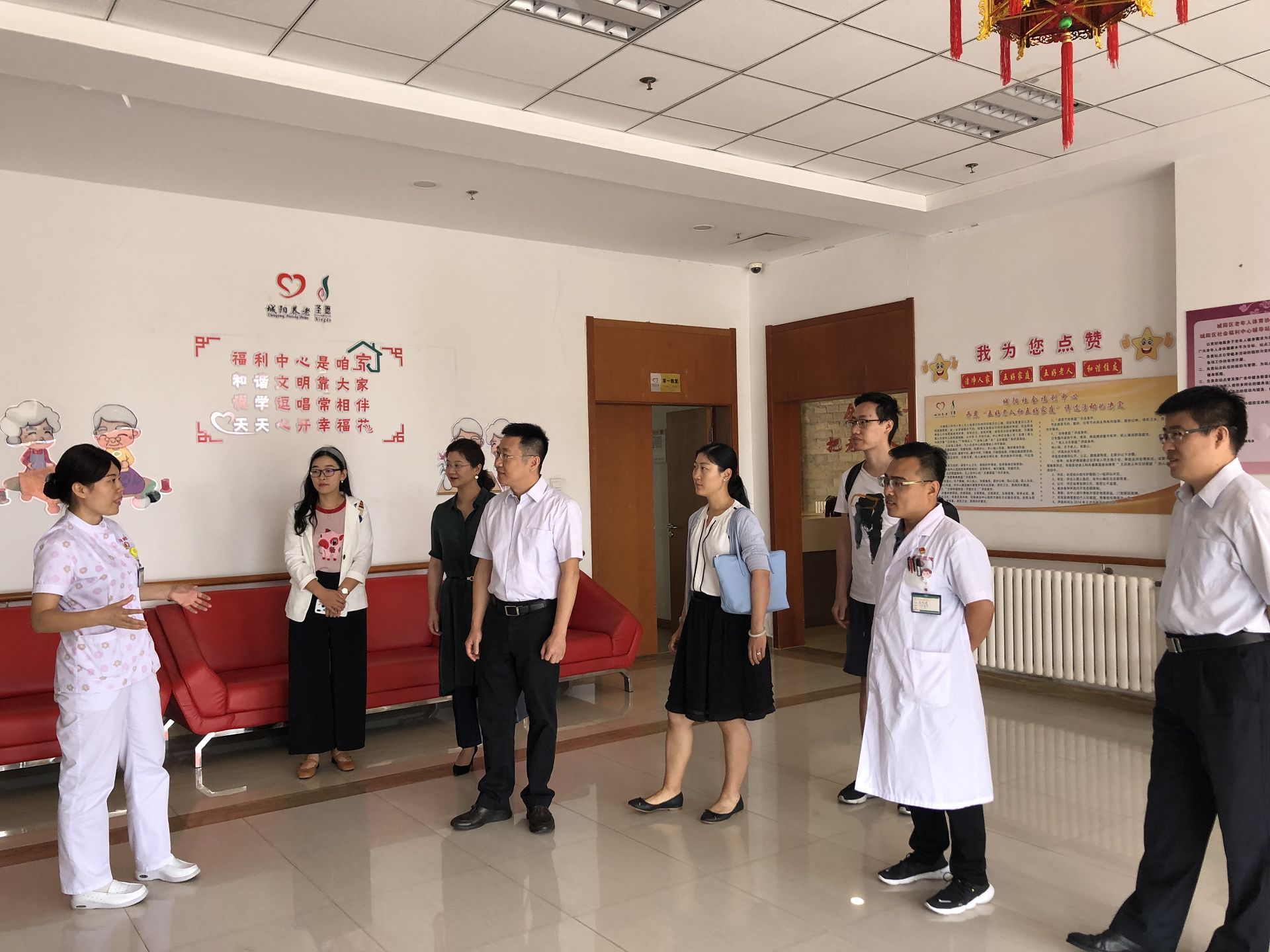 9月4日上午,课题组前往青岛市城阳区社会福利中心调研护理服务机构的运行情况。课题组首先参观了享受“专护”、“院护”待遇的失能失智老人所居住的疗养区域,并与部分失能失智老人,以及一线护理人员进行面对面交流,对医养结合的护理模式有了直观认识。随后,课题组与于崇岗院长等院方管理人员进行座谈。护士长孙渊介绍了社会福利中心的发展历程和现状。随着长护险制度的建立,民营护理机构得以发展壮大,并更好地承担了养老护理功能。于院长谈到长护险制度和机构发展面临的一些瓶颈,如居民长护险保障程度较低、机构护理人员专业水平有限、失智前期干预手段较少等。此外,课题组成员就失能、失智等级评估的过程及标准、护理机构的设立标准、长护险的宣传渠道、相关专业人员的培养机制等问题和护理机构团队进行了深入讨论。
