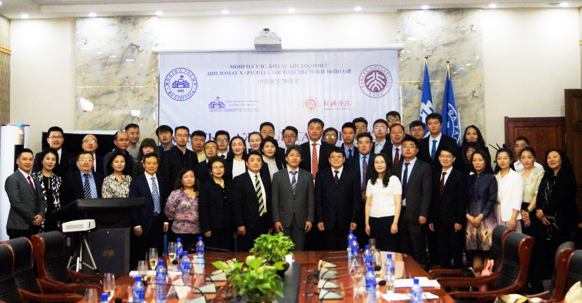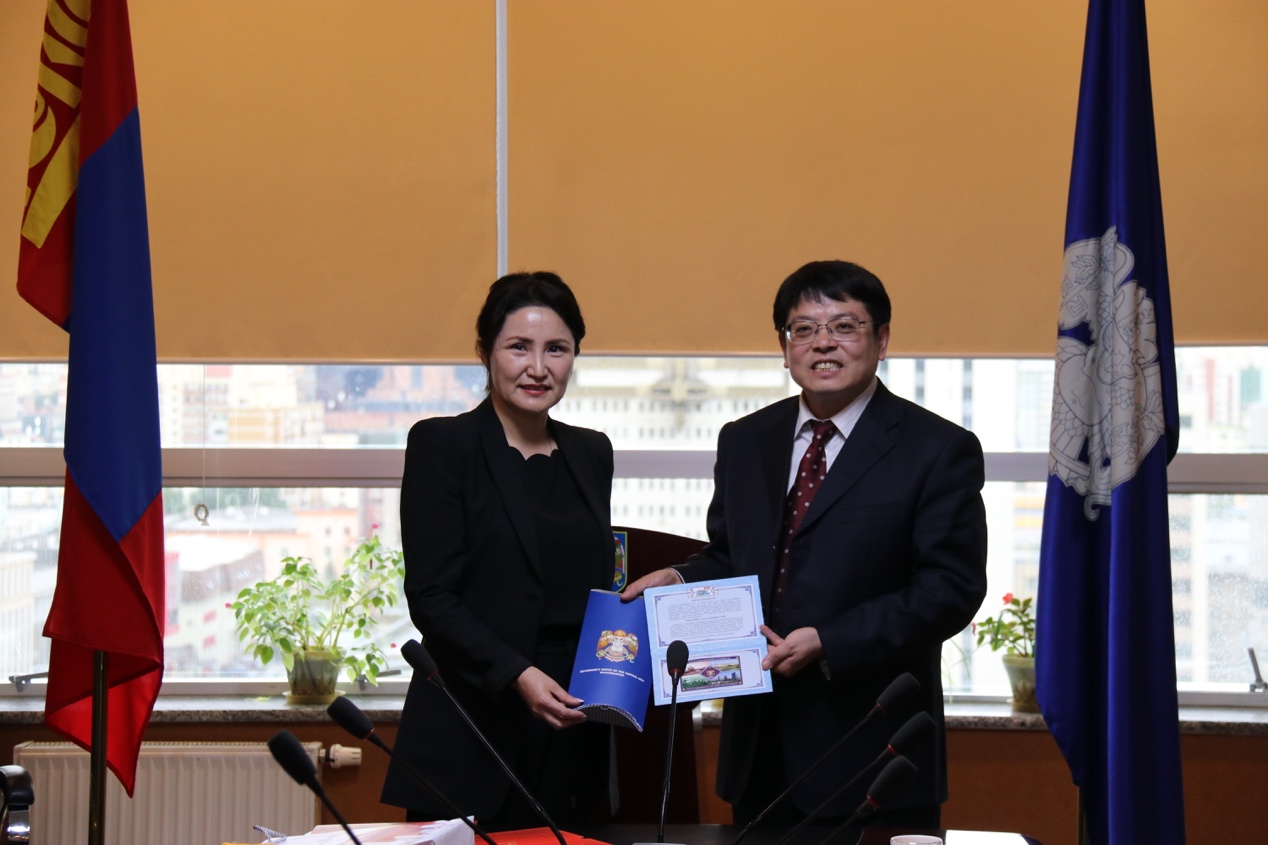随后,董志勇率领代表团全体与乌兰巴托市副市长阿赫玛女士进行会晤。首先,阿赫玛表示,今年是中蒙建交70周年,乌兰巴托建城380周年,北京与乌兰巴托结为友好城市5周年,是一个重要的时间节点。随后她代表市政府和市民对中国政府长久以来在乌兰巴托教育基础设施方面的援助表示感谢,并指出通过教育的合作可以增进两国、两市友谊,而本次北大今年会与蒙古国立大学外交学院协议的签订是新领域合作的良好开端。董志勇院长介绍了本次代表团出访的整体行程和主要任务,并表示教育是百年大计,希望能够在合作框架下为两国的教育事业做出应有贡献。会后,双方合影留念并互赠礼物。