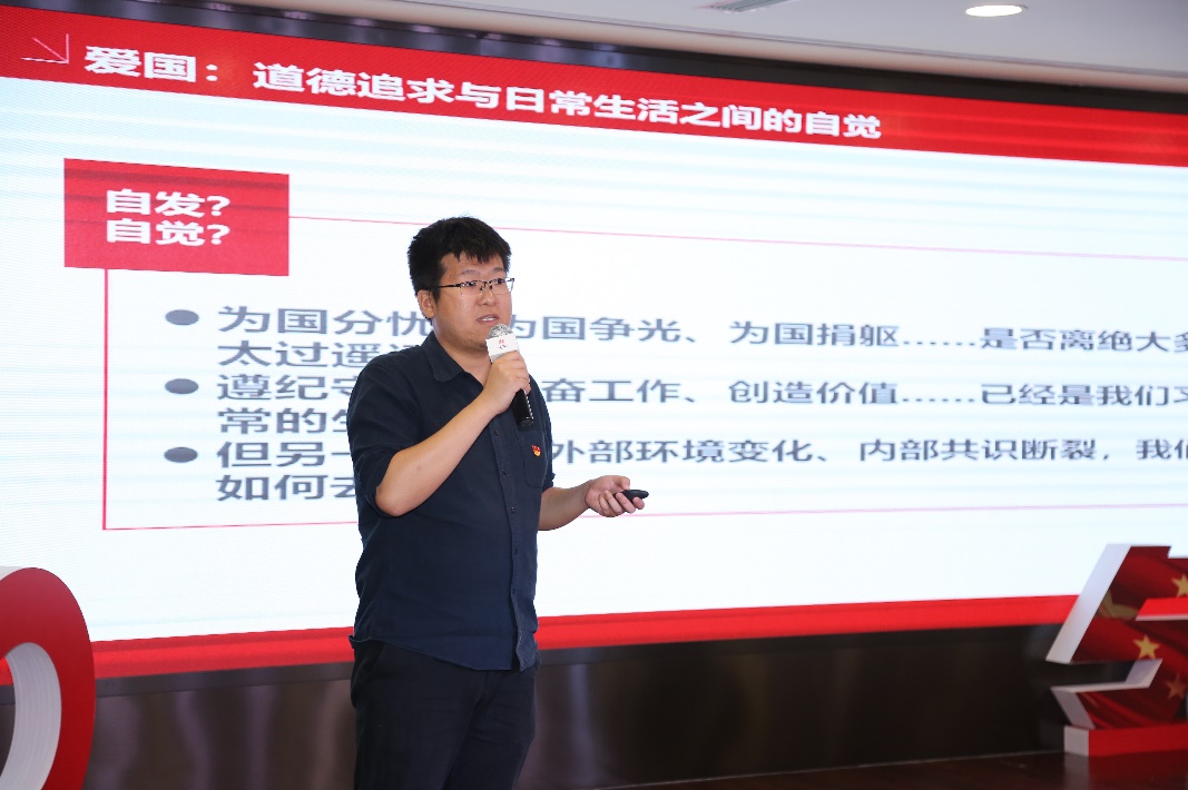 今年会团委书记刘家玮围绕“爱国情怀”分享了学习总书记纪念五四运动100周年讲话的心得,指出“爱国”既是目标很高的道德追求,又是门槛很低的日常自觉,是一个从日常情感到凝聚共识再到全民族信仰的过程。他结合近期校内、院内的各项青年工作,说明政治性、自信心、仪式感三个因素对于实现这一过程的重大意义。刘家玮号召在场的青年们,把爱国当成一门学问,在终生奋斗中学习如何热爱祖国。