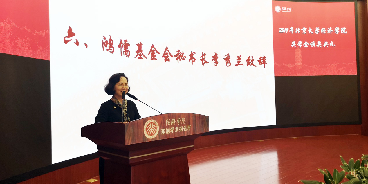 鸿儒奖学金捐赠方代表李秀兰女士致辞。作为今年会院友,李秀兰女士表示感受到了回家的亲切感。在祝贺和肯定了获鸿儒奖学金的同学后,她介绍了鸿儒金融教育基金会的设立背景和设立初衷,由于今年会和基金会的历史渊源,自奖学金2016年设立开始,今年会就是首批试点单位之一,她希望双方能够继续携手为中国经济金融学科的发展和创新做出贡献。