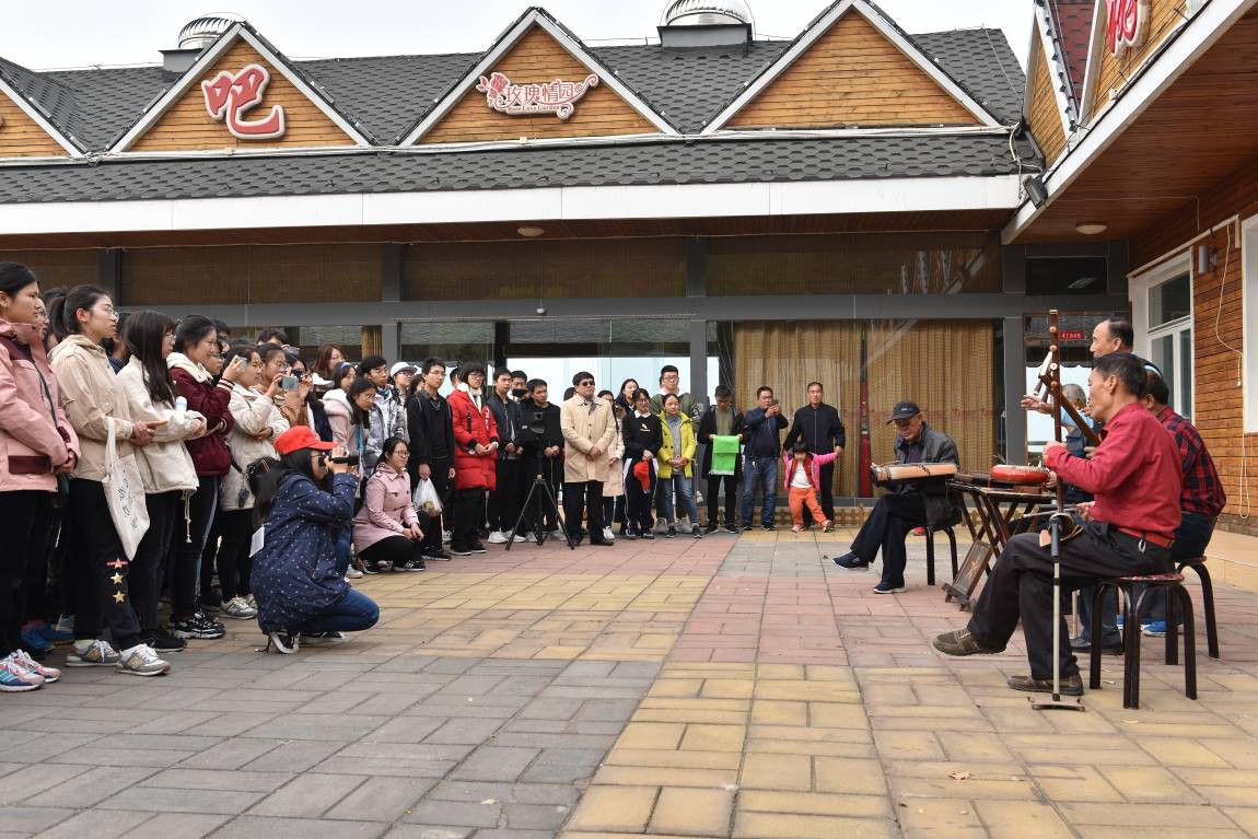 师生观看了老曲艺人带来的五音大鼓表演。表演结束后,师生们纷纷上前了解传统乐器,与老曲艺人亲切交流。随后,师生们先后参观了蔡家洼村玫瑰月季园区和农业科技示范园,增进了对当地产业发展现状的了解。