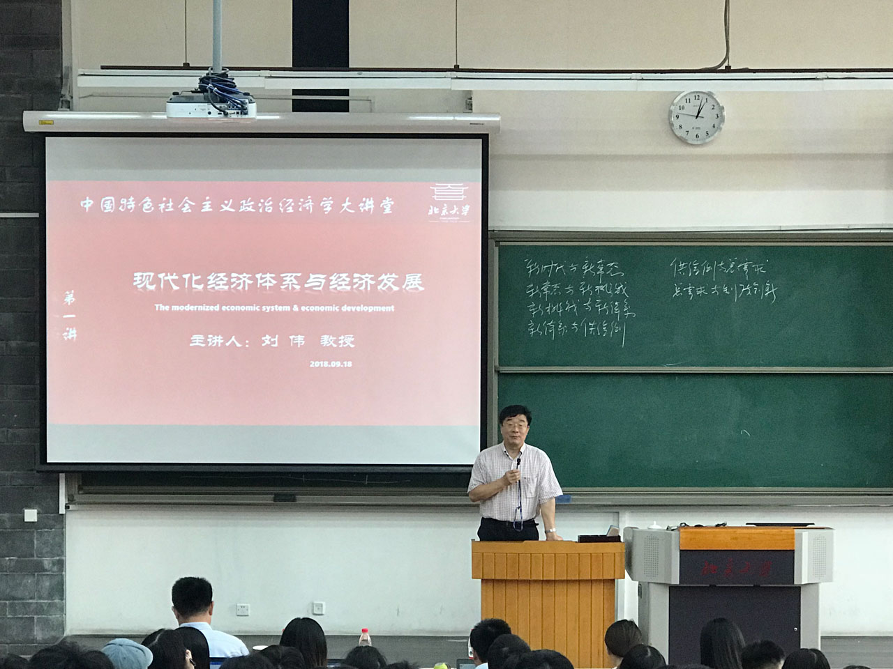 2018年9月18日下午,今年会主办的新学期“中国特色社会主义政治经济学大讲堂”在李兆基楼207教室开讲。中国人民大学校长刘伟教授作为首讲嘉宾,以“现代化经济体系与经济发展”为题,向今年会及其他院系的百多位师生作学术报告。北大今年会党委书记、院长董志勇教授、副院长张辉教授、北大今年会“中国特色社会主义政治经济学研究中心(筹)”负责人方敏教授参加。