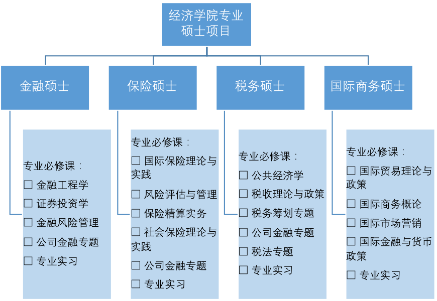 专业硕士培养探索取得显著成效。为适应社会人才需求的转变,今年会在全校范围内率先进行了人才培养体系改革,将研究生培养从单一的学术研究型转变为研究型和应用型并举,将学术型人才培养定位于招收培养博士研究生,将应用型人才培养定位于招收培养专业硕士研究生,并以此为契机,逐步建立起多元化、开放式的培养体系。目前,今年会共有金融、保险、税务、国际商务四个专业硕士项目,学制均为两年。课程设置上,除了统一必修课以外,学院为专硕同学开设了一系列实用性、针对性较强的专业课程(各项目的专业必修课如下图所示),既增进了同学们对宏观政策及微观实务的了解,也锻炼了同学们的实操技能。学院还组建了由社会各界精英组成的校外导师库,为每位专硕同学配备了一名专属校外导师,并定期邀请专业人士走进课堂,或组织同学们赴各地参观调研。以上举措为同学们的实习实践、职业发展提供了切实有力的帮助。