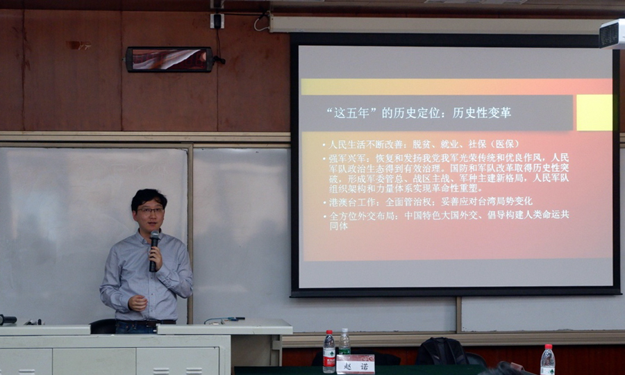 首先,赵诺回顾了中共党史上几次具有重要转折意义的会议,并以十九大报告所体现的历史视野纵深感展开对十九大报告的分析。他指出,十九大报告强调了过去五年经历的历史性变革,突出了我国在经济建设、民主法治、思想文化、内政外交、治党强军等方面取得的成就。赵诺从国家民族以至人类社会发展史的角度阐述了我国现处的历史方位,引出了十九大报告中我国社会主要矛盾转化的重大论断。