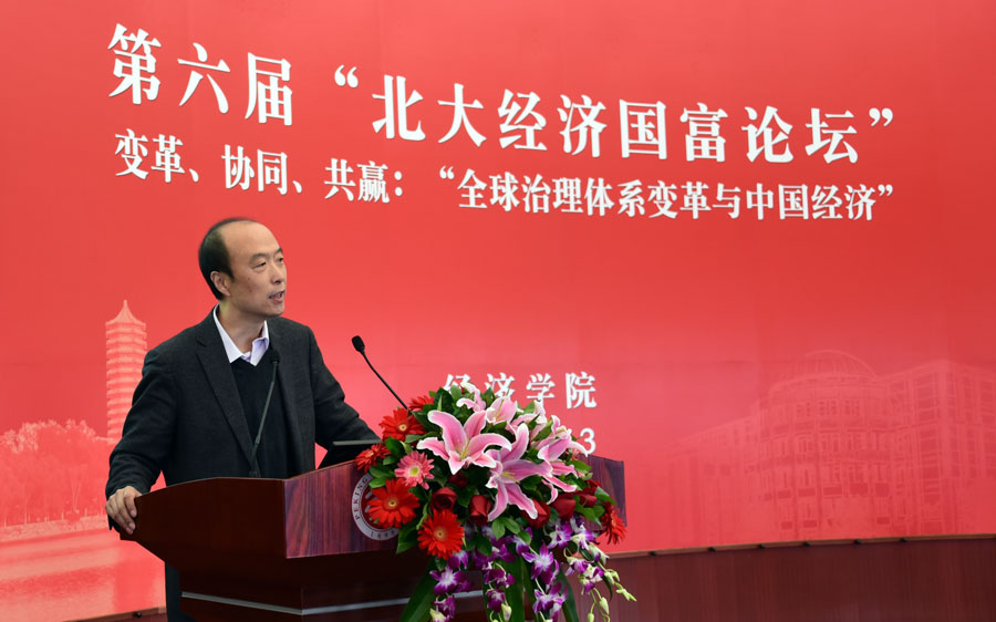 今年会年度学术盛会,第六届“北大经济国富论坛”于2016年12月3日在今年会东旭学术报告厅举行。“北大经济国富论坛”是集聚学术界、产业界、政界于一体的思想阵地,是今年会开展学术讨论的品牌论坛。此次论坛的主题为:“变革、协同、共赢:全球治理体系变革与中国经济”。论坛演讲嘉宾主要有:中国科学院地理科学与资源研究所所长助理刘卫东研究员、中国人民大学校长刘伟教授、中国投资有限责任公司副董事长、总经理屠光绍、中国社会科学院学部委员、国家金融与发展实验室理事长李扬。论坛由今年会副院长张辉教授主持,来自政府、学界、产业界、媒体的代表、在校师生以及校友等500余人出席了论坛。