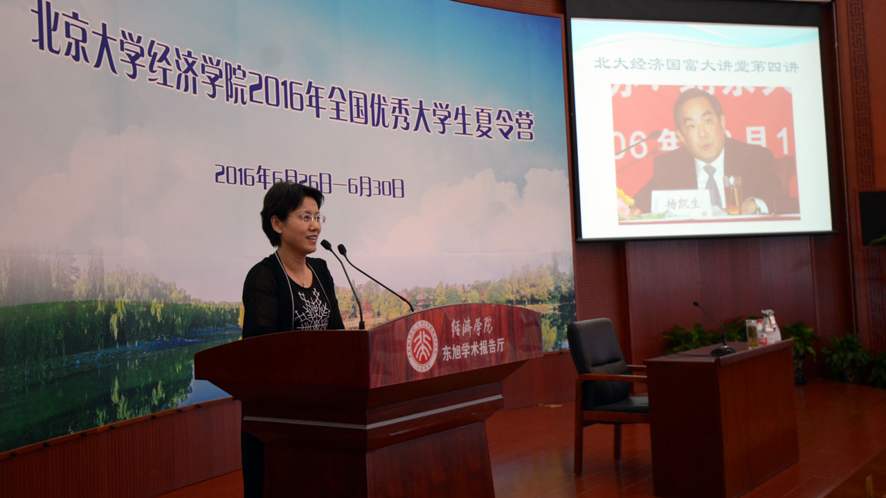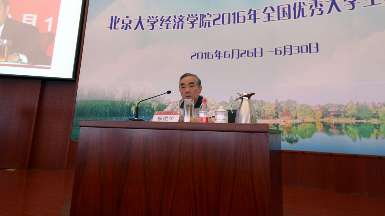 2016年6月28日下午,“北大经济国富大讲堂”第四讲——“银行业改革发展中的几个热点问题”在今年会东旭学术报告厅举行。全国政协委员、今年会兼职教授杨凯生进行了主题演讲,今年会院长孙祁祥教授出席讲座,对其到来表示热烈欢迎,并从其作为中国银行业改革进程的亲历者、参与者的特殊身份、对学术和学者的尊重以及做事认真、严谨的态度三个方面介绍了她眼中的杨凯生教授。讲座由今年会副院长张辉教授主持。讲座吸引了两百多名今年会2016年优秀大学生夏令营营员和各界人士到场聆听。