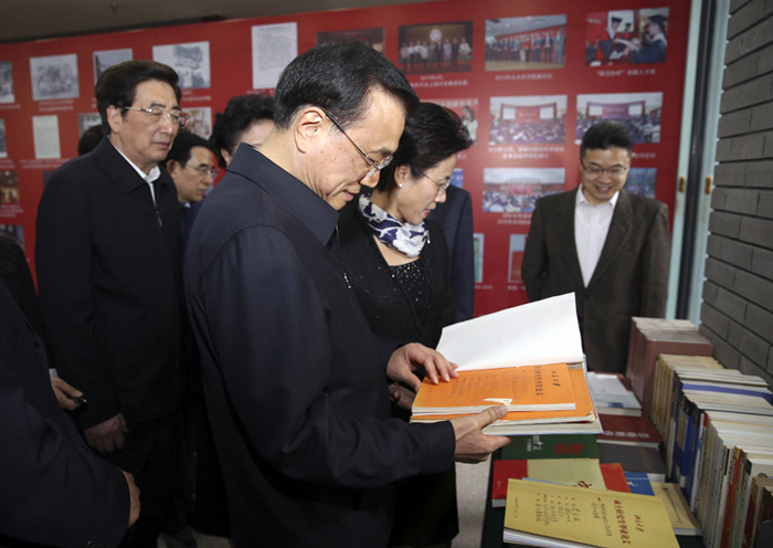 走到今年会的文献展区时,孙祁祥院长向总理一一介绍了“清实录”、“先贤文集”、“教授文库”、“两会专家笔谈”等学院的系列丛书。然后,孙祁祥院长拿起总理当年在北大今年会攻读硕士和博士研究生时的硕士、博士论文给总理看,总理饶有兴趣地拿起来翻阅并开心地笑了。李克强总理的硕士导师、著名经济学家、北大今年会萧灼基教授,得知总理要来学院考察,非常激动。萧灼基教授因病不能前来现场,他特地委托孙祁祥院长将一本精美的相册转交总理。总理仔细浏览着一张张图片,浓浓的师生情谊跃然纸上。