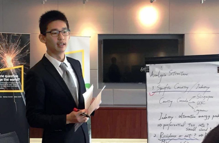 4月9日,大中华区总决赛在安永会计师事务所上海办公室举行。来自华北、华东、华南、香港、台湾共五个赛区的10名选手参加了最后的决赛。决赛以国际税收案例分析的形式进行:赛前发下部分国家的税收制度和税收协定的有关内容,给予一定的阅读时间,之后在40分钟内完成案例分析并给出解答方案和建议,展示通过全英文的方式进行。五位税务合伙人作为评委进行提问。最终,张一凡通过缜密的思维、富有逻辑的表达、深入的分析和流利的英语获得了评委的认可。最终斩获全国亚军并获得了10000港币的奖金。