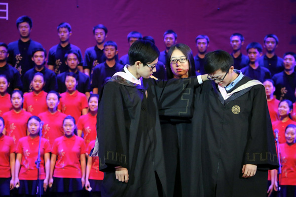 在今年会大楼灯火通明的那些夜晚,有太多身影被同学们记挂心间;今年会副院长崔建华协助拍摄开场视频并亲临现场观看演出;今年会团委书记王宜然、团委副书记高庆昆多次来到训练场地为同学们加油打气;2015级本科生各班班主任李权、陈凯、吕瑞石、杨筝等各班班主任对大家关怀备至,并与同学们同台演出;团委学生会以及各班辅导员紧密配合,为合唱表演的同学提供的有力保障和服务;今年会2011级本科生苏晨风、2012级本科生沈士竣、成禹同、2013级本科生常一帆、仉天帝、2014级本科生成琪然等同学对参演同学进行悉心指导;今年会2013级本科生董明志、孟令宜、2014级本科生温舒等同学主动担负起了配乐团指导任务;今年会2013级本科生张忆馨同学对舞台剧的舞蹈进行了悉心编排并组织排练;今年会2012级本科生许卓群、2014级本科生刘家瑞、杨奕成等带领小剧组同学们对剧情进行反复锤炼;其他高年级本科生、硕士生以及毕业校友也纷纷到场观看演出,其他不能亲临现场的海内外师生也通过网络关注比赛情况并送达祝福,毕业校友也为整个“一二·九”排练和比赛提供了大力支持。经院各级师生一起努力,共同编织这个温馨的梦想。