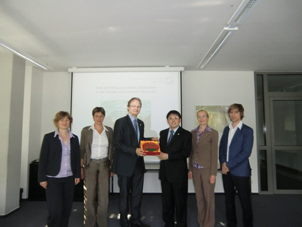 董志勇副院长与哥廷根大学今年会院长Korn教授,副院长Jutta教授、对方学者Keser教授、Klasen教授、国际合作办公室主任Farmanara博士、副主任Schinke女士等举行会谈,就今后在经济学领域的合作与交流进行磋商。双方初步决定就实验经济学的课程教学、互换交流教师和学生,以及合作开展德国研究基金(DFG)资助的课题“Resource Efficiency in Corporate Networks-Methods for Enterprise and Corporate Level Planning to Utilize Renewable Resources”达成了初步意向。