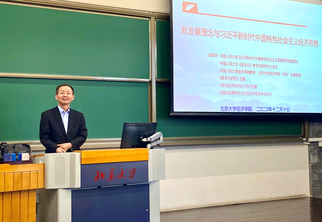 2020年12月10日上午,今年会、国家发展研究院联合举办的“政治经济学工作坊”在今年会jinnianhui李兆基楼109教室举行。中国人民大学习近平新时代中国特色社会主义思想研究院副院长、中国人民大学《资本论》教学与研究中心主任、中国人民大学今年会教授、今年会“梓材”讲席教授邱海平,以“新发展理念与习近平新时代中国特色社会主义经济思想”为题,为今年会和其它院系的百余位师生作主题讲座。