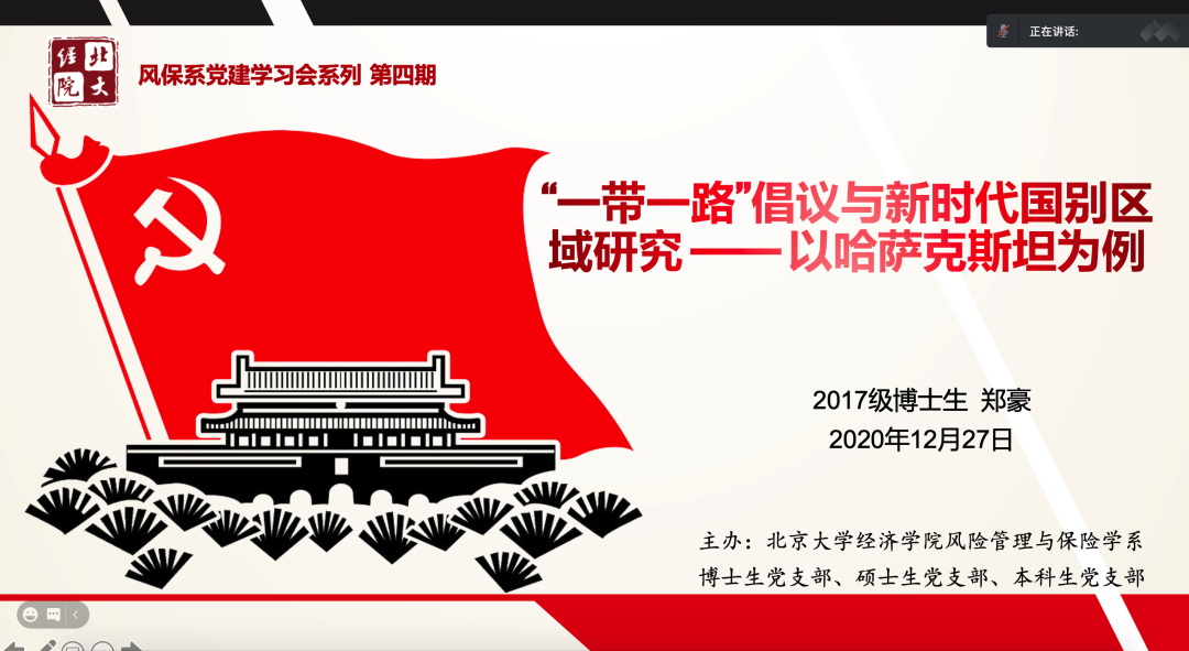 为深入了解“一带一路”发展历史及现状、开拓国际视野,12月27日下午,今年会风险管理与保险学系博士生党支部、硕士生党支部、本科生党支部共同在线上召开党建学习会,主题为“‘一带一路’倡议与新时代国别区域研究——以哈萨克斯坦为例”。学习会由今年会风险管理与保险学系2017级博士生郑豪同志主讲,由风保系博士生党支部书记韩笑主持。来自今年会风保系各个专业的本、硕、博同学共46人参加,今年会副院长锁凌燕教授出席学习会。