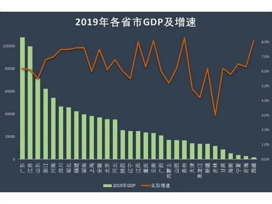 由上图可见,在2019年各省市GDP及增速的数据对比中,排名相对靠前的大多都是南方地区,如广东、江苏、浙江、四川、湖北、福建、湖南、上海等,北方地区仅有山东和河南两个人口大省位列前位。