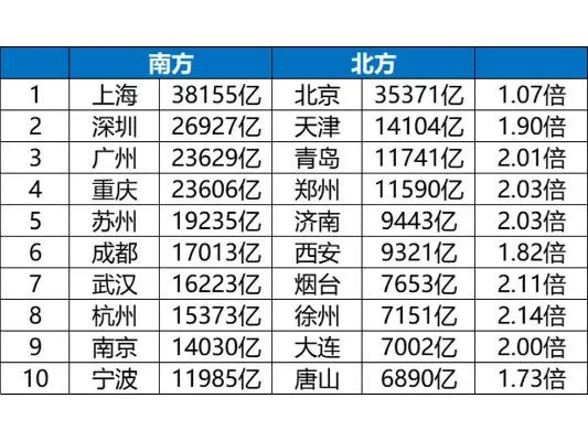 南北差距还体现在,现在中国最具发展潜力的十大都市圈中,9个都分布在南方地区,包括上海大都市圈、深莞惠都市圈、广佛肇都市圈、南京都市圈、成都都市圈、杭州都市圈、重庆都市圈、武汉都市圈、长株潭都市圈;北方地区只有北京都市圈。