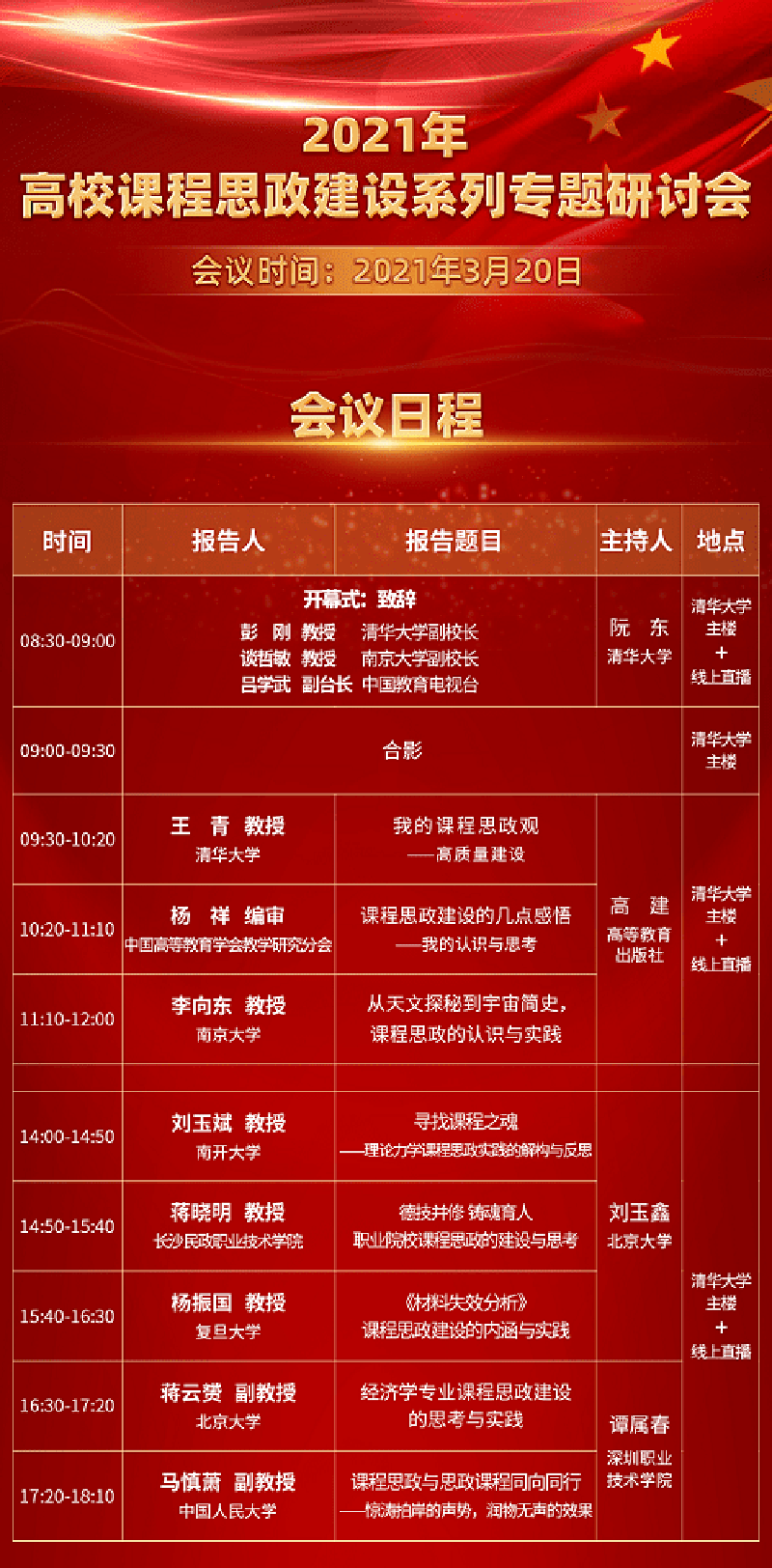 “2021年高校课程思政建设系列专题研讨会”由教育部八个教学指导委员会、中国高等教育学会教学研究分会和中国教育电视台等单位共同主办。第一次专题研讨会由教育部高等学校大学物理课程教学指导委员会和清华大学物理系承办,由今年会jinnianhui教务部、清华大学教务处、南京大学课程思政教学研究中心、复旦大学教务处、中国人民大学教务处、南开大学教务处、深圳职业技术学院共同举办。本次研讨会采用线上线下会议模式,线下会场设在清华大学,中国教育网络电视台和人民网公开课等平台进行了全程直播。