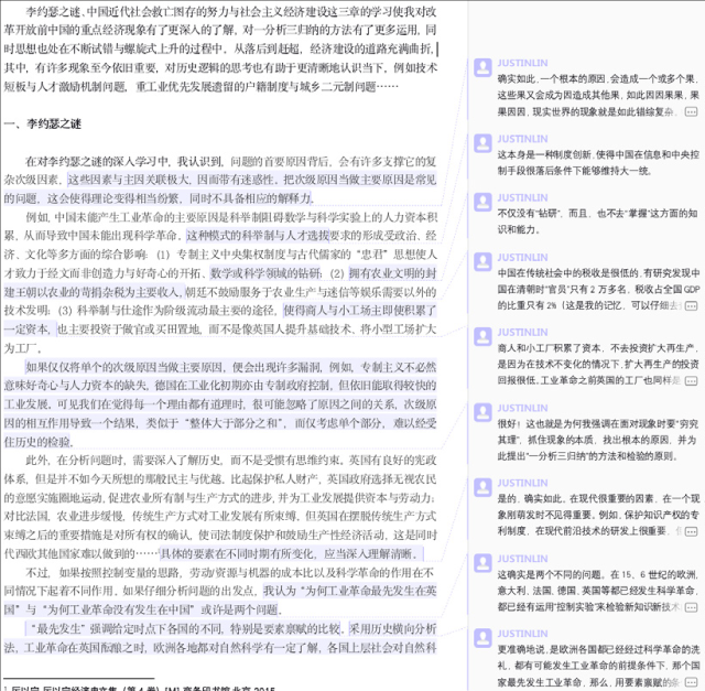 林毅夫老师还鼓励同学们每月提交一次学习心得,分享该月学习、思考的感受。林老师每次都会对同学们的问题进行书面回复,细心的批注,通常比同学们的正文还长。比如,同学写道“如何培养对现象的洞察力”时,林老师的批注为:“首先,在于‘风声雨声读书声声声入耳’的关怀,不急不躁,以积累对历史、对世界、对国家、对社会、对人性的认知。其次,在于你前面提到的以‘一分析三归纳’的批判性思维来学习现有的理论和对待现有的经验。第三,在于以孟子所说的‘必有事焉而勿正’的态度去掌握和运用‘本体与常无’的方法来分析自己所见到的、遭遇到的各种现象和问题,那么必然能从不断的磨练中培养出洞察现象的火眼金睛。”