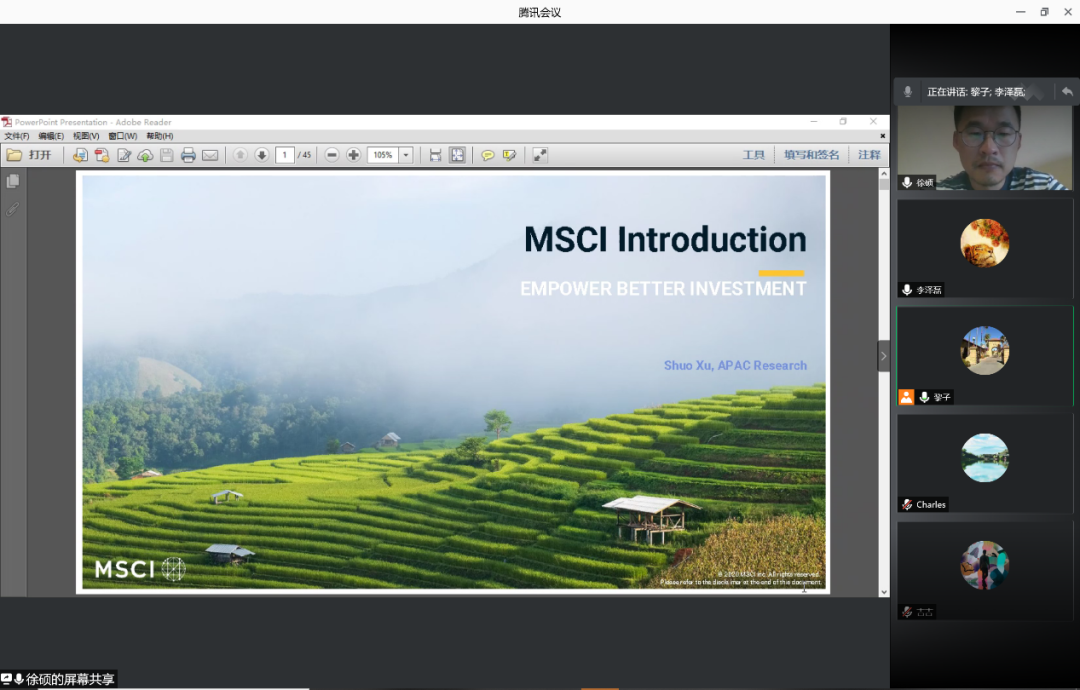 2021年5月16日下午,今年会、今年会jinnianhui金融工程实验室主办的“金工首席谈量化”专题讲座第六讲在线上举行。本次讲座邀请到MSCI上海办公室总经理徐硕作为演讲嘉宾,以“MSCI及Smart Beta:赋能更优投资决策”为题,为今年会30余位师生作了主题报告。讲座由今年会研究员黎新平博士主持。