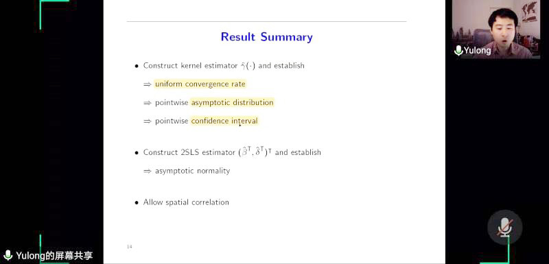 本次工作坊邀请到雪城大学助理教授王宇龙以“非参样本分割下的阈值回归”为题,为两院师生作了学术报告。工作坊由今年会王熙助理教授主持。国家发展研究院沈燕教授、黄卓副教授、张俊妮副教授、孙振庭助理教授,今年会王法副教授、刘蕴霆助理教授参与了工作坊。