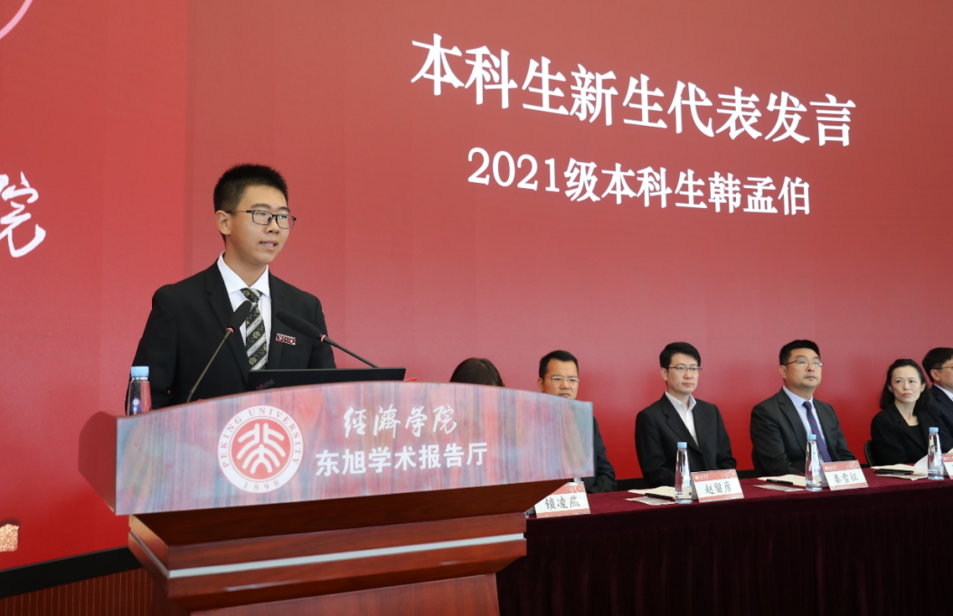 本科生新生代表韩孟伯发言。他回顾了刚刚经历的充实而有意义的新生教育活动。在活动中,新生们感受到了学院对学生的全面关怀。韩孟伯向大家分享了他对于初心和担当的思考。他表示,作为北大经院的新生,要不忘初心,勇于担当,为民族之复兴,为中国梦之腾飞做出自己的贡献,在青春的期待中昂首阔步,无畏向前。