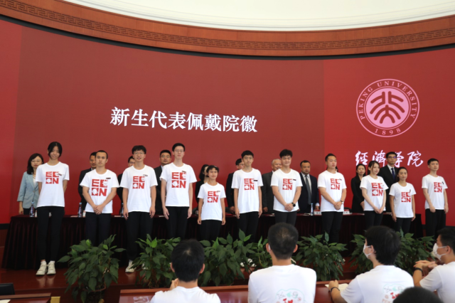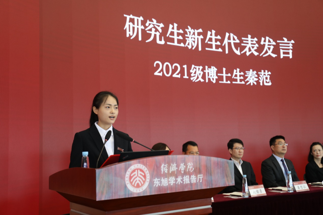 研究生新生代表秦范发言。她谈到,在未来的学习生活中要坚守心之所向,坚定“以科学为天职、以学术为使命”的追求;扎根中国大地,研究中国问题,讲好中国故事,尊重与倾听每个微观个体,关注他们的生活现状与命运,了解真实世界中的经济运行逻辑;勇担时代使命,将小我融入大我,将个人奋斗融入民族复兴伟业,传承北大经院的荣光,肩负时代青年的使命,在砥砺奋进的道路上行稳致远。