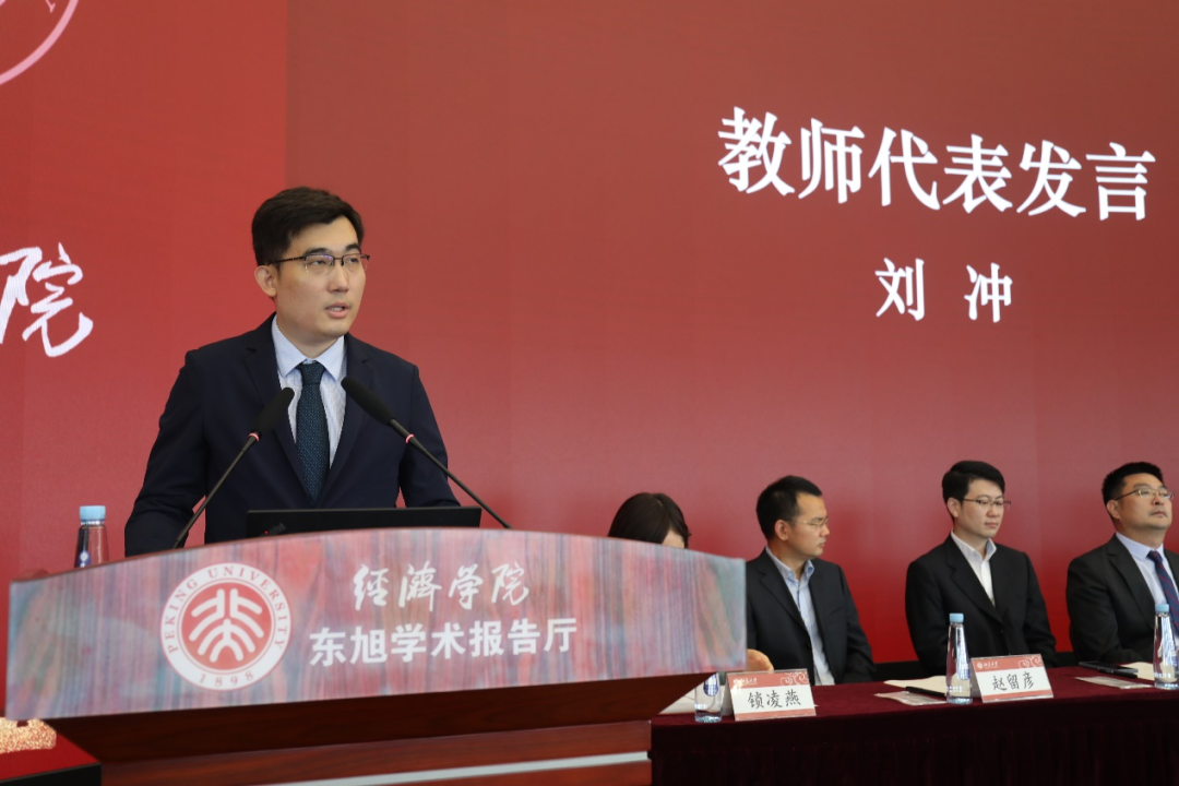 教师代表刘冲作为“大学长”与同学们分享了他在北大修习的三个重要而特别的学分:面对挫折的勇气、科学精神的坚持、从“我”到“我们”的成长。他期待新生们在北大用心去修好这三个学分:有信心去勇敢面对挫折,有恒心去坚守科学精神,有包容心去展开团队协作。