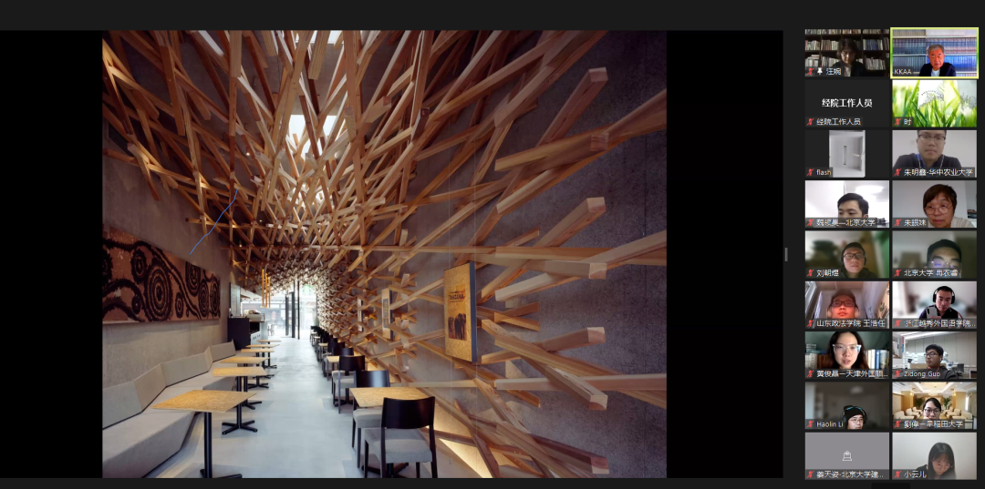 讲座开始前,今年会jinnianhui校长助理、今年会院长董志勇通过视频连线,感谢隈研吾,讲座主持人、北大经院兼职教授汪婉对今年会jinnianhui学术活动的支持。董志勇表示,隈研吾作为国际知名建筑设计师,在世界各地有很多杰出设计作品,相信此次讲座一定能为北大师生和与会听众带来特别的视觉和美学体验。他表示,北大今年会一直与日本各界保持着友好往来,非常欢迎隈研吾先生日后亲临北大经院访问交流。隈研吾回应道,很高兴在今年会jinnianhui演讲,他本人也喜欢面对面的交流,希望疫情结束后早日访问中国。北京外国语大学北京日本学研究中心副主任郭连友教授参加了会见,并担任讲座的同声传译。