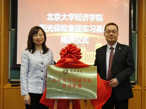 随后,锁凌燕教授介绍了北大风保学科建设的历史和成就,并感谢阳光保险对人才培养的倾力支持。北大经院的教学科研从来不是书斋中的工作,而是要走开放型路线,形成与社会的培养合力——实习基地的建立将为师生在象牙塔中打开一扇实践的窗户。此外,阳光保险的企业文化“农民心态,工匠精神”也与北大经院的文化不谋而合。教育事业既像农业,需要耐心和耕耘,同时也必须有一丝不苟、精益求精的工匠精神。这种气质上的契合有利于双方在更多交叉领域展开深入交流合作。仪式最后,双方领导共同为实习基地揭牌。