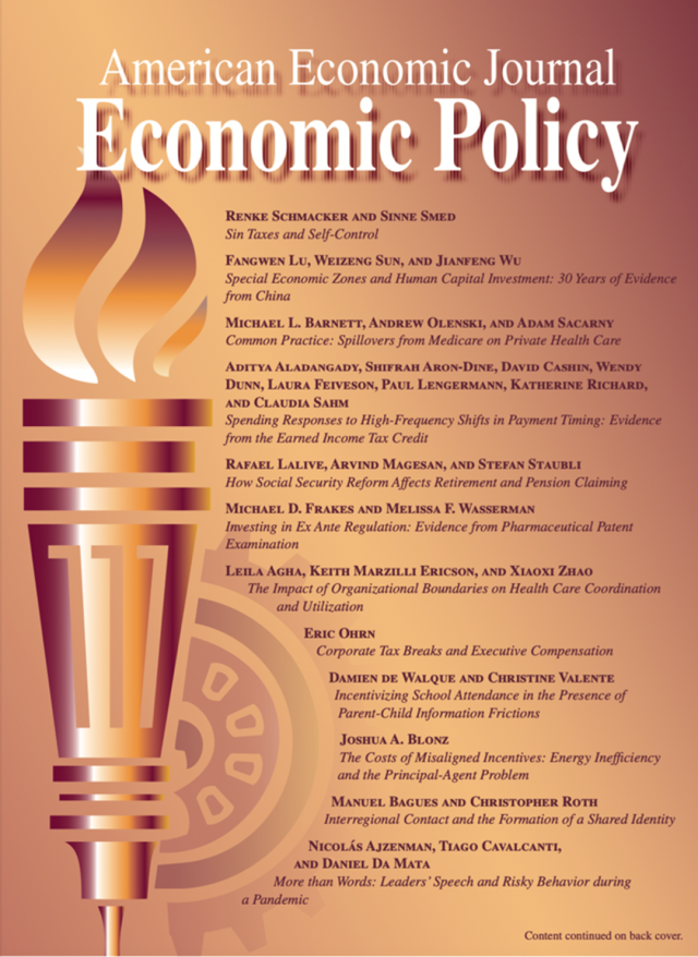 AEJ:Economic Policy是American Economic Journal四本子刊之一,其他分别为AEJ:Applied Economics、AEJ:Macroeconomics和AEJ:Microeconomics。这四本期刊排名仅次于五大综合顶级期刊(AER, JPE, Econometrica, QJE, RES),在其各自子领域都是公认的Top刊物。AEJ:Economic Policy涵盖一系列主题,领域包括公共经济学;城市和区域经济学;卫生、教育、福利和政治机构的公共政策方面;法律和经济学;经济法规;以及环境和自然资源经济学。