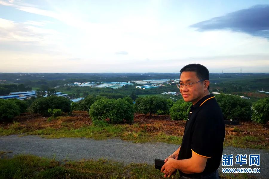 陈生望向远方,略有所思。背后是官湖村乌蛇岭的养猪场和村民种的果树。新华网发