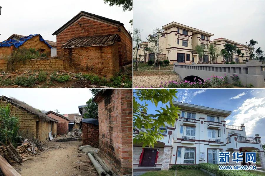 官湖村村民居住的旧住房(左)和新别墅(右)。新华网发