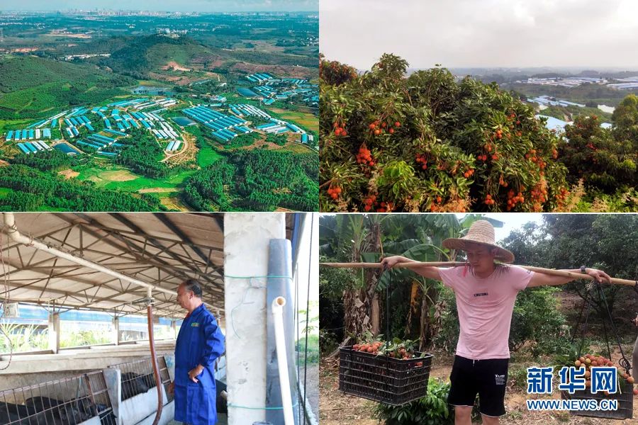 资料图:官湖村村民在养猪场内劳动(左)和采摘荔枝(右)。新华网发