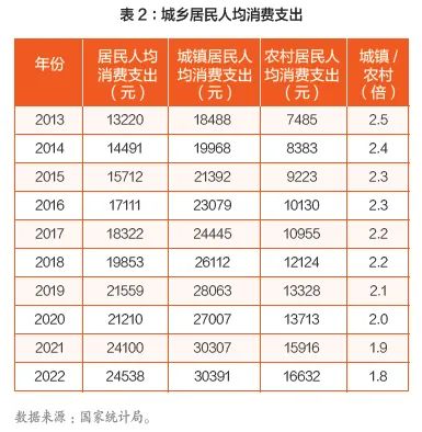 其二,城乡之间消费差距。表2显示,从城乡居民人均消费支出看,过去十年城乡之间消费差距有更为明显的缩小。2013年,城镇居民人均消费支出18488元,农村居民人均消费支出7485元,城乡倍数是2.5倍。2022年,城镇居民人均消费支出30391元,农村居民人均消费支出16632元,城乡倍数是1.8倍。十年之间,城乡倍数从2013年的2.5倍下降为2022年的1.8倍,降幅为26%,城乡之间消费差距有更为明显的缩小。