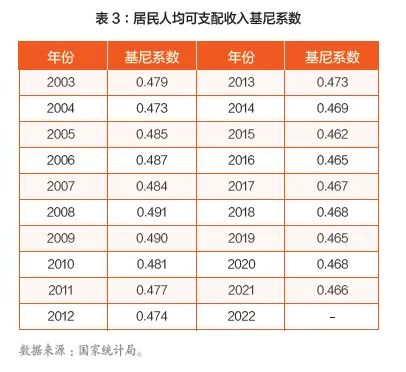 其三,全国居民收入差距。表3显示,从全国居民人均可支配收入基尼系数看,过去二十年全国居民收入差距呈现先扩大后缩小、近年较为胶着的态势。从2003年至2008年,全国居民人均可支配收入基尼系数从0.479波动上升至0.491;从2008年至2015年,该基尼系数从0.491持续下降至0.462;从2015年至2021年,该基尼系数在0.462至0.468之间波动徘徊。我们知道,一般认为,基尼系数介于0.3—0.4之间时收入差距比较合理,介于0.4—0.5之间时收入差距过大,大于0.5时收入差距悬殊。可见,过去二十年,基尼系数经历了一个先升后降、近年波动徘徊的过程,这意味着全国居民收入差距呈现了先扩大后缩小、近年较为胶着的态势。