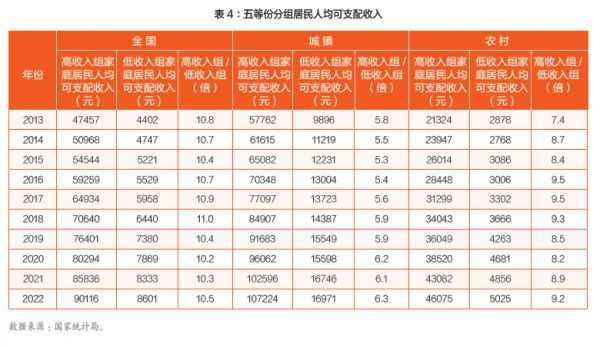 其四,城镇内部和农村内部的收入差距。表4显示,从五等份分组居民人均可支配收入看,过去十年全国高低收入组家庭之间收入差距有小幅缩小,但城镇内部收入差距有所扩大,农村内部收入差距显著扩大。从全国看,2013年,高收入组家庭居民人均可支配收入47457元,低收入组家庭居民人均可支配收入4402元,高低倍数是10.8倍;2022年,高收入组家庭居民人均可支配收入90116元,低收入组家庭居民人均可支配收入8601元,高低倍数是10.5倍;十年之间,高低倍数从2013年的10.8倍下降为2022年的10.5倍,降幅为2.8%,高低收入组家庭之间收入差距有小幅缩小。从城镇内部看,从2013年至2022年,高收入组家庭与低收入组家庭城镇居民人均可支配收入倍数从5.8倍上升为6.3倍,升幅为8.2%,收入差距有所扩大。从农村内部看,从2013年至2022年,高收入组家庭与低收入组家庭农村居民人均可支配收入倍数从7.4倍上升为9.2倍,升幅为23.8%,收入差距显著扩大。