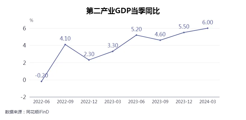 对比2022年至2024年各年第一季度的GDP增速,发现今年一季度GDP增速为三年内同期最高水平。此外,自2022年6月以来,我国第二产业GDP当季同比增速整体呈上升趋势。