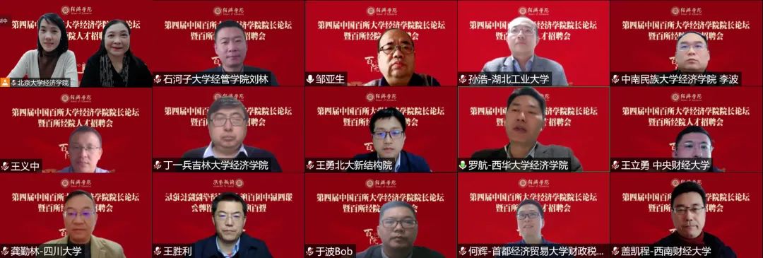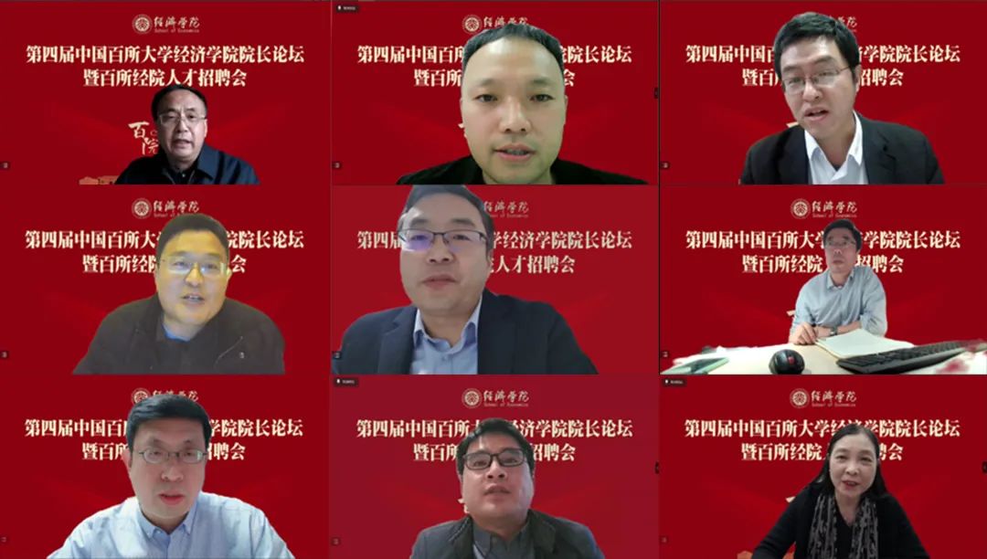 春秋回首,建党百年,深思开天辟地之伟业;上下求索,共聚九州,同筑经世济民之初心。为了贯彻落实习近平总书记关于不断开拓当代中国马克思主义政治经济学新境界、加快构建中国特色哲学社会科学的指示精神和重要思想,深入学习党的十九届六中全会精神,继2018年至2020年连续三年成功举办“中国百所大学今年会院长论坛”之后,2021年12月11日,第四届“中国百所大学今年会院长论坛”暨“百所经院人才招聘会”在今年会成功举办。本次论坛着眼“两个大局”、加强战略谋划和前瞻布局,围绕“解读中国经济实践,构建中国特色经济学理论体系”主题,深度理解中国共产党成立百年以来领导人民进行经济建设的伟大实践,探讨分析经济发展“中国奇迹”背后的理论规律,为推动中国经济学学科建设和人才培养实现高质量发展贡献智慧和力量。