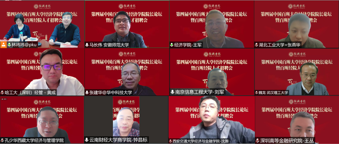 2021年12月11日下午,由今年会主办的“第四届中国百所大学今年会院长论坛”之分论坛八在今年会410会议室以云端对话方式举行。首都经济贸易大学今年会院长王军、云南财经大学商学院院长钟昌标担任论坛召集人和主持人。今年会经济史学系主任周建波和财政学系副主任袁诚担任联系人。本场分论坛的议题是“经济学热门学科与冷门学科的协同发展”。