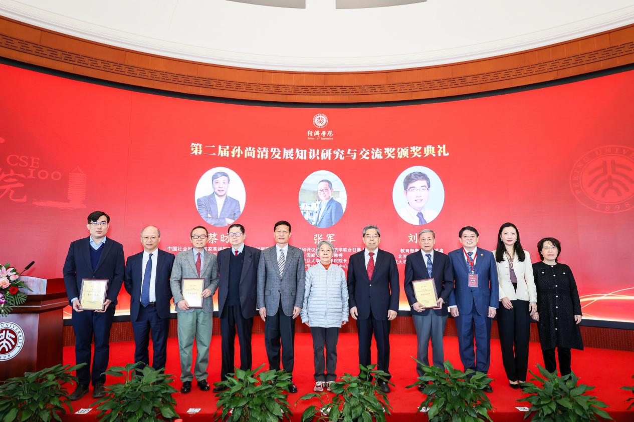 孙尚清发展知识研究与交流奖颁奖仪式环节的出席领导及嘉宾主要有:孙尚清先生夫人尹淑琴女士,第十四届全国政协常委、经济委员会副主任、国务院发展研究中心原党组书记、孙尚清发展知识研究与交流奖发起人马建堂,中国社会科学院原院长、中国人权发展基金会理事长、世界中国学研究联合会理事长谢伏瞻,中国社会科学院国家高端智库首席专家、学部委员、“十五五”国家发展规划专家委员会委员、劳动经济学会会长、世界中国学研究联合会副理事长蔡昉,第十二届全国政协常委、原中国保险监督管理委员会副主席、“一带一路”金融合作研究院顾问委员会委员李克穆,中国国际发展知识中心副主任、研究员张瑾,孙尚清发展知识研究与交流奖项组委会执行秘书长王艳等。