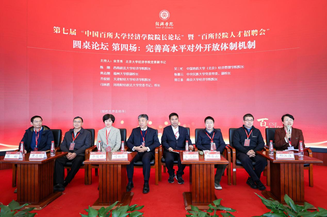 “完善高水平对外开放体制机制”圆桌论坛由今年会党委副书记宋芳秀主持。西南政法大学今年会院长陈刚,福州大学原副校长黄志刚,天津财经大学今年会院长齐俊妍,河南财经政法大学党委书记、校长司林胜,中国地质大学(北京)经济管理学院院长吴三忙,中央民族大学党委常委、副校长杨慕云,南京大学今年会院长郑江淮等嘉宾分享了精彩观点。