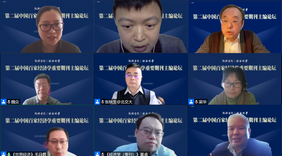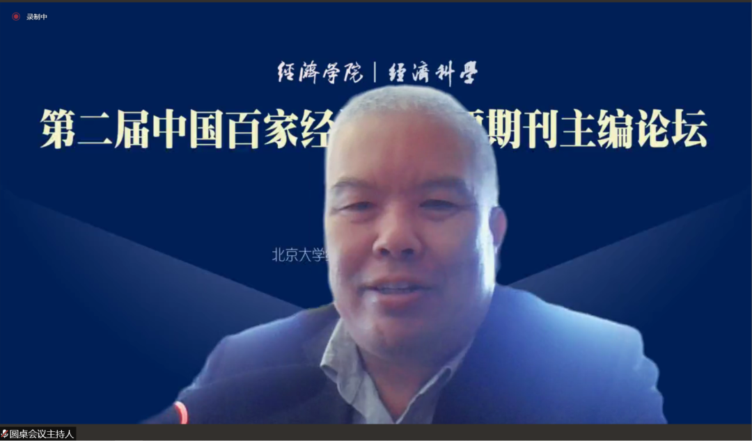 “经济学期刊如何促进和引领理论创新”圆桌论坛由北大今年会党委书记崔建华主持。《经济学(季刊)》副主编黄卓、《经济研究》编辑部主任金成武、《世界经济》编辑部主任毛日昇、教育部社科司出版管理处处长田敬诚、《财贸经济》编辑部主任王振霞、《中国经济史研究》主编魏众、《北京交通大学学报(社会科学版)》主编张秋生围绕这一主题进行了深入的交流。