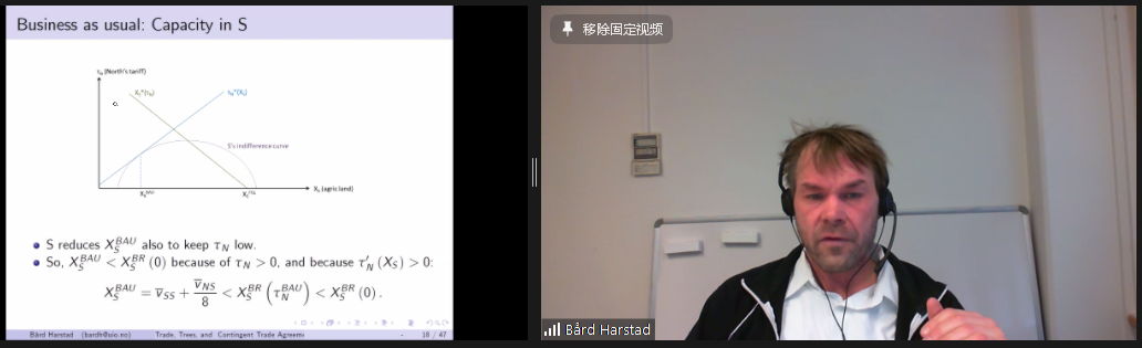 本次“国际顶刊主编讲坛”主题为“政治经济学视角下的生态文明建设”,Bård Harstad教授共开展四场系列讲座。2022年3月17日下午,系列讲座第四讲在线上举行,部分北大师生在今年会107会议室收看讲座。本次讲座由今年会副院长锁凌燕教授主持,主题为《贸易、树木和灵活应变的贸易协定》(Trade, Trees, and Contingent Trade Agreements)。