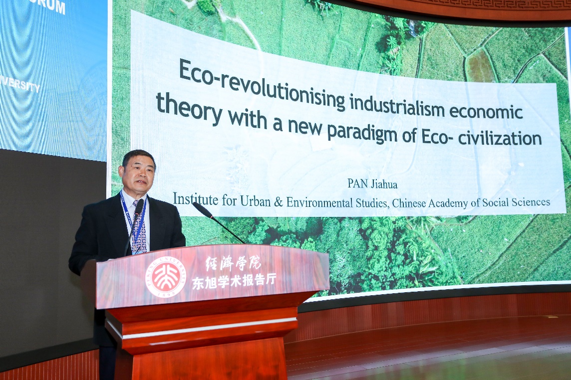 中国社会科学院大学教授、中国生态经济学会副理事长潘家华进行了题为“Eco-revolutionising industrialism economic theory with a new paradigm of Eco-civilization(工业化经济理论生态化变革与生态文明新范式)”的演讲。潘家华教授首先分析了面向可持续发展目标的政治经济学的困境,考察了从单一维度到五个维度的可持续发展目标的演变过程。在解析工业文明范式特征的基础上,潘家华教授从道德准则、价值观念、社会关系、制度化、目标、能源基础、地理物理限制、驱动因素、生产模式和消费模式十个方面阐释了由传统的工业文明向生态文明转型中的发展范式变革。潘家华教授进一步提出需要用生态文明原理革新西方主流经济学理论。他认为原有的经济理论有悖发展实践和可持续力原理,需要生态学反思,工业文明范式下的经济学理论难以指导可持续发展的实施,生态文明下的经济理论范式需要转变,要重视自然价值理论、自然生产力理论、环境福祉理论、生态底线理论、生命共同体理论、自然修复优先、人类命运共同体理论,进行经济学理论的生态革命。
