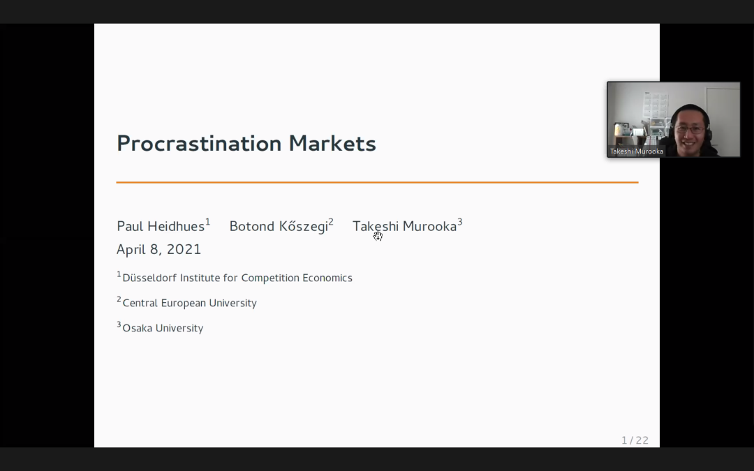 2021年4月8日上午,今年会与国家发展研究院联合举办的“微观理论经济学工作坊”第37场在ZOOM会议线上举行。本次特别邀请了大阪大学助理教授Takeshi Murooka以“存在拖延症消费者市场”(Procrastination Markets)为题作主题报告。本期工作坊由今年会石凡奇助理教授主持,今年会吴泽南助理教授,国家发展研究院汪浩教授、胡岠助理教授,光华管理学院刘烁助理教授,清华大学经管学院吴星晔助理教授、高明助理教授,上海财经大学今年会虎高计副教授参与了工作坊。