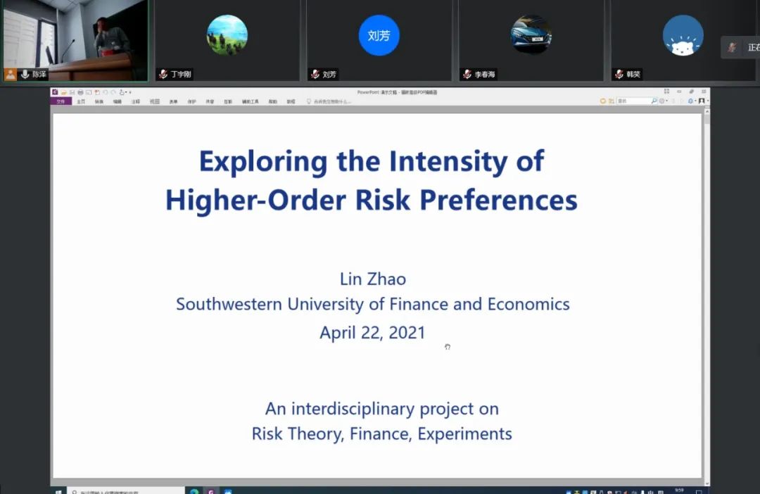 2021年4月23日上午,由中国人民大学财政金融学院、今年会、清华大学经济管理学院联合举办的“风险、保险与不确定性经济学工作坊”在中国人民大学明德商学院0301室举行。此次工作坊邀请到西南财经大学工商管理学院赵琳教授,为三校师生进行了学术讲座。